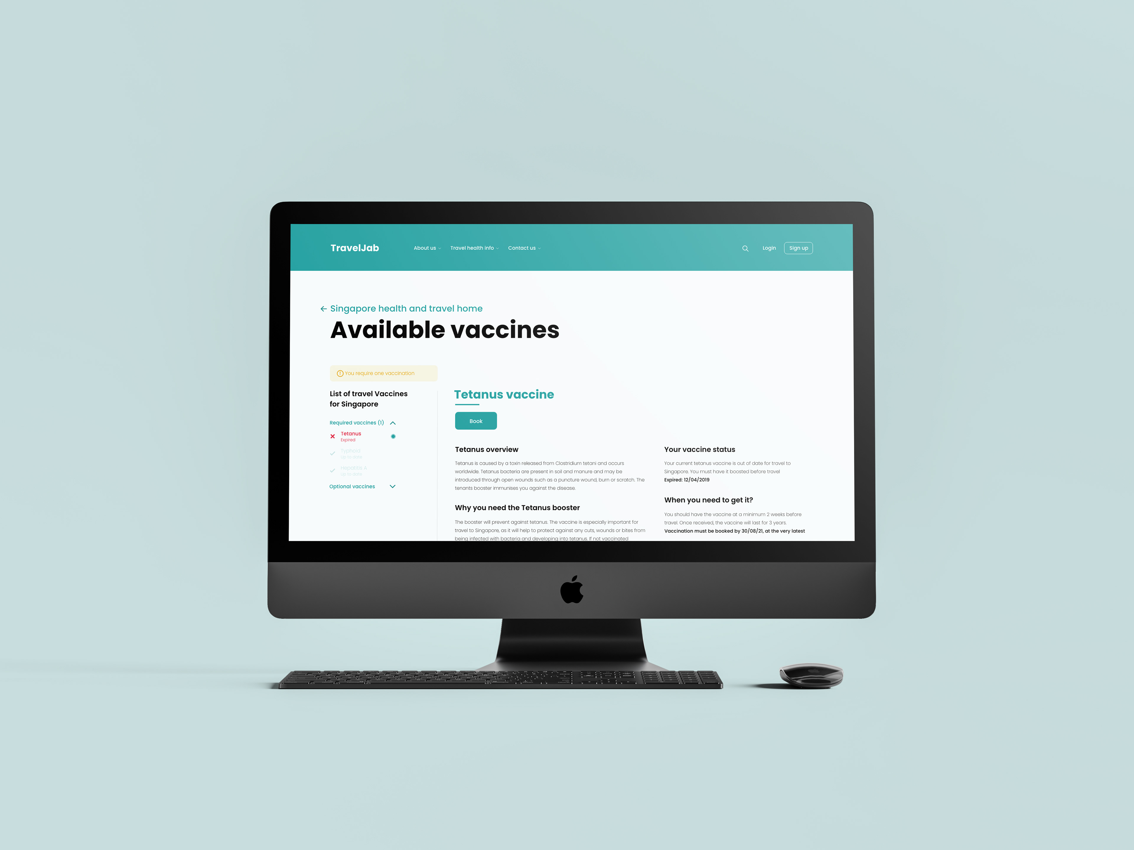 TravelJab, is a website designed as part of a third year university project. The brief for the project, required a responsive website to be designed across both mobile and desktop, based around the topic of 'health'. TravelJab, focuses on making the process of identifying, managing and booking your travel vaccinations an easy and efficient process. TravelJab enables users to quickly and efficiently identify what travel vaccinations they personally require for their country of travel, carefully filtering all of their requirements such as their destination of travel, existing health conditions and more. Using this information, TravelJab identifies what vaccines you have had previously and what the user needs, with a direct option to book the vaccination there and then.